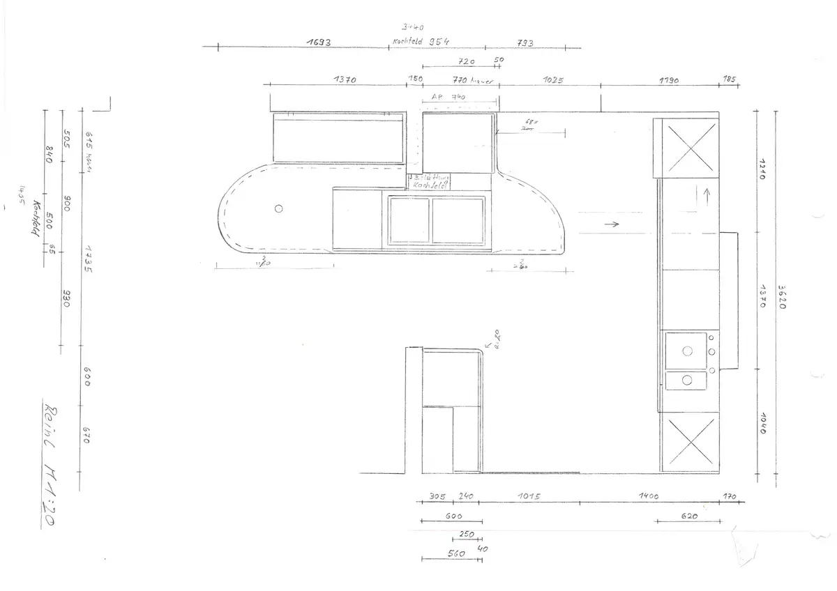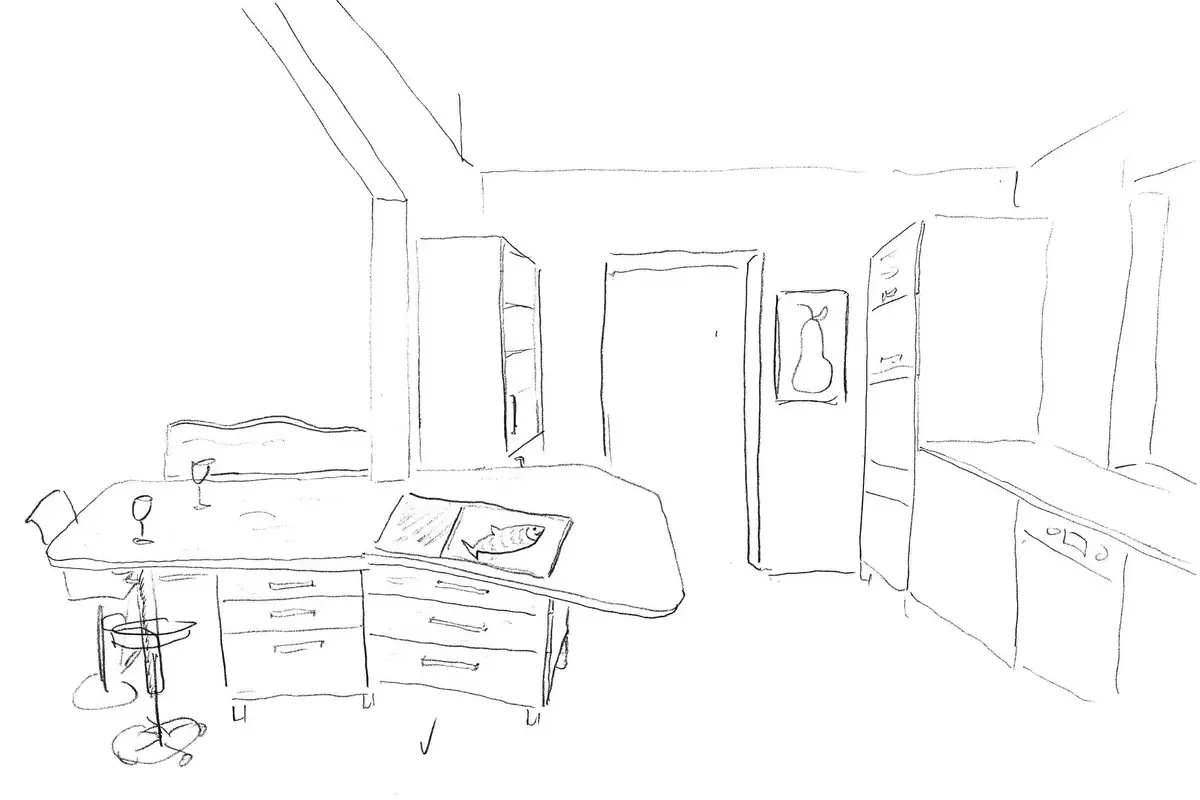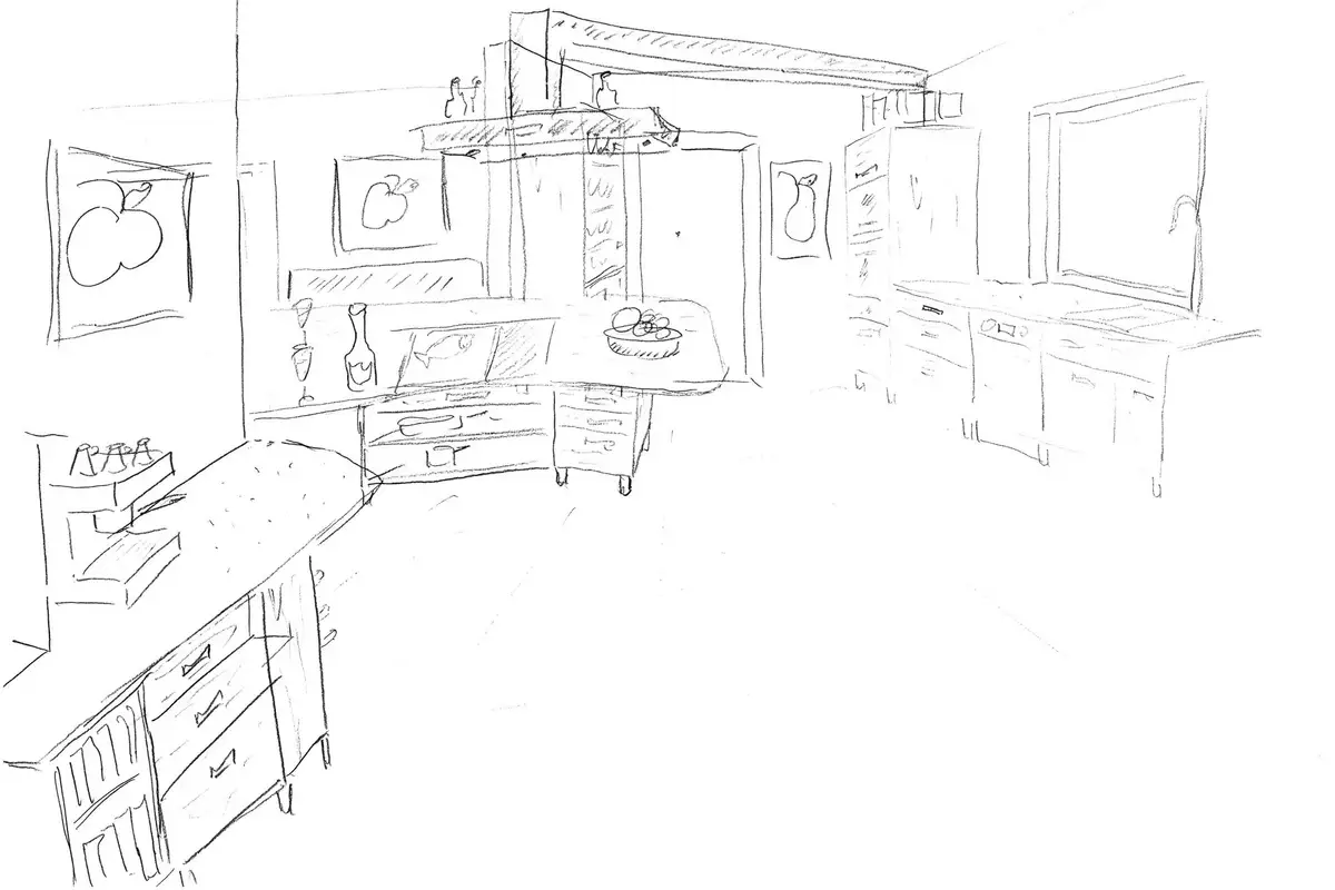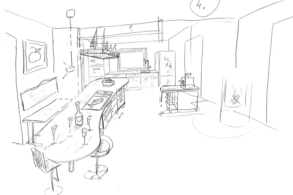 bekocht und dabei etwas gezeichnet. Kurze Zeit später hatten wir eine Skizze einer Küche auf