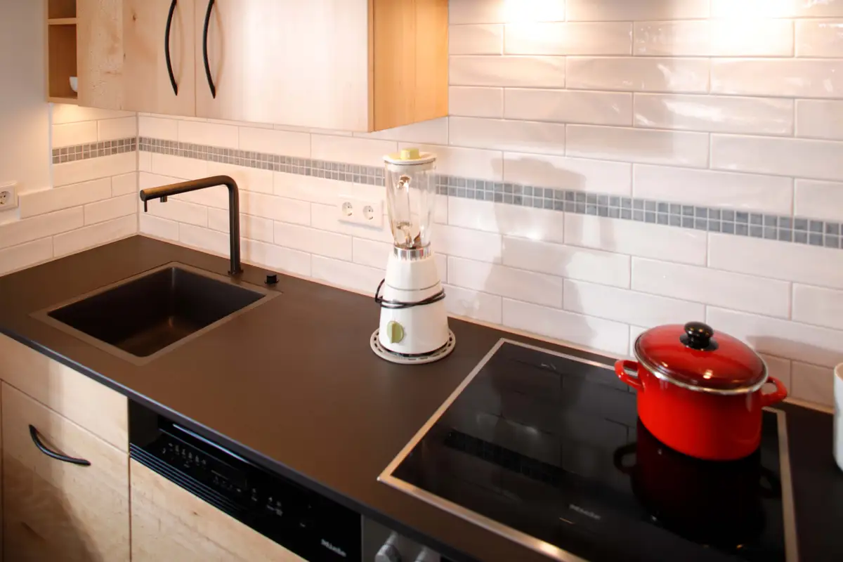 Backofenhochschrank mit Druckdampfgarer und Tellerwärmer, Spülenarbeitsplatte aus Keramik
