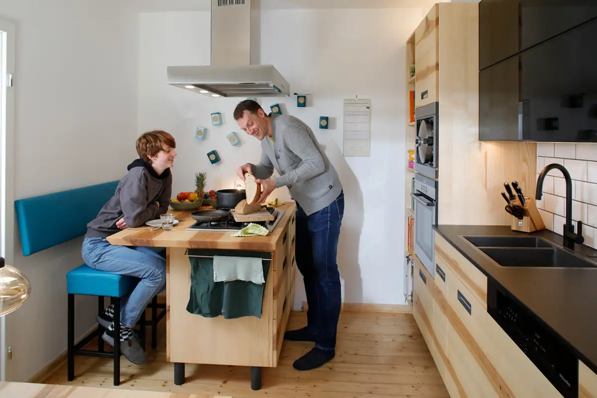 Die Kücheninsel ist nicht riesig, aber trotzdem ständig bewohnt, weil das Zusammensitzen beim Kochen eine ganz andere Qualität hat, als wenn man nur zwei Meter weiter rechts am Essplatz sitzt. Denn bereits während des Kochens schildern Kinder, Partner, Freunde die Erlebnisse des Tages. Man sieht und hört sich und das Kochen verliert den Charakter des Arbeitens, es wird vielmehr zum wichtigen Teil des kommunikativen Familienlebens, nicht nur bei "Father and Son".