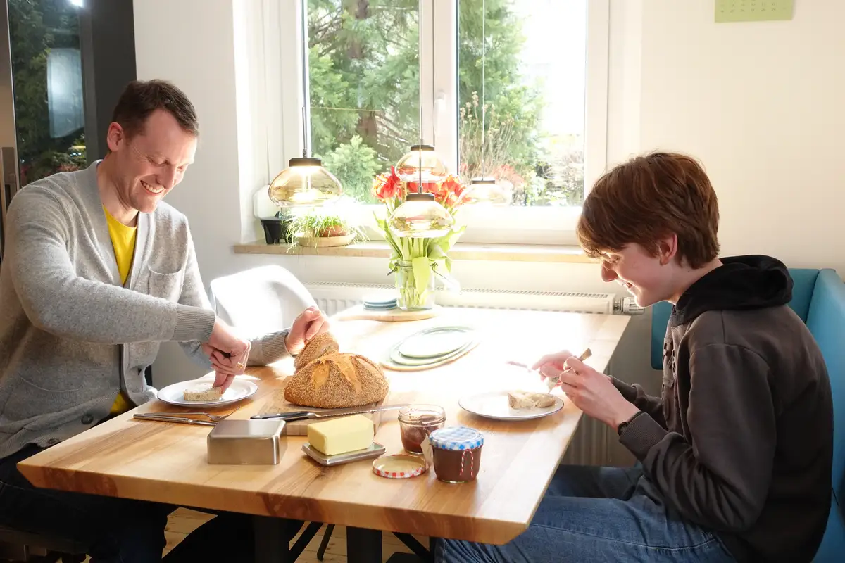 Father bäckt Brot und Kuchen für den Son und die Familie. Beide präsentieren die neue Küche, die mit nichtmal 3 Metern Tiefe und 415 cm Breite keinen Millimeter zu groß ist, um noch eine Kochinsel und einen Essplatz unterzubingen.