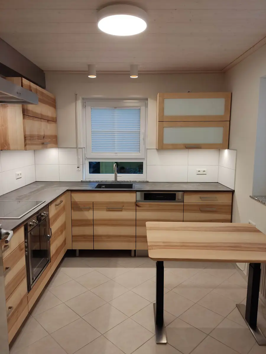 Die Geschichte unsrer Zusammenarbeit beschreiben Sabine und Ferdinand weiter unten selbst, wir stellen hier deren L-Küche in Esche vor: Die dreht sich hauptsächlich um den Manz-Brotbackofen, der zusammen mit seinem verbundenen Kochfeld schon vorhanden war und so die ebenfalls denkbare Kochinsel vereitelte. Das Problem, dass der "normale Tisch" in der Mitte als Arbeitsplatz wegfällt, weil er zu niedrig ist, um daran arbeiten zu können, lösten wir mit einem höhenverstellbaren Gestell von Linak. Je nachdem, wer dran arbeiten will, stellt sich den Tisch auf seine persönliche ergonomische Höhe ein, was vor allem beim Teigkneten ausgesprochen rückenfreundlich ist.