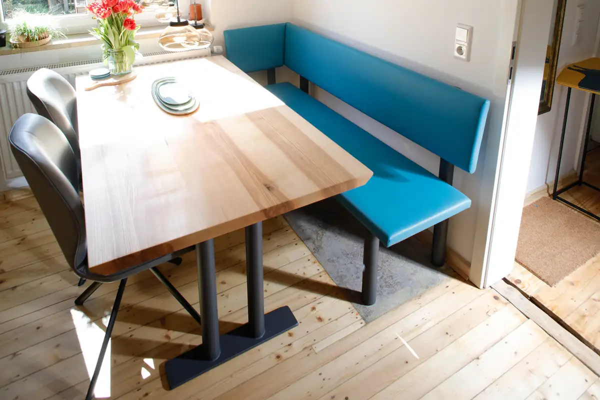 Die Küchenfüße und Tischgestelle sind aus pulverbeschichtetem Schwarzstahl