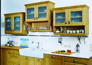 Unsere Massivholzküchen entstehen in Einzelanfertigung, weshalb wir prinzipiell stilistisch völlig offen, nur qualitativ etwas verbohrt sind, da machen wir nämlich keine Abstriche. Wenn das Landhaus ihre bevorzugte Stilrichtung ist, bekommen die Türchen meistens Rähmchen und Applattungen (leichte Schrägen), die Oberschränke bekommen Baldachine oder Profilleisten und der Griff wird heimelig. Weil das auf unserer chronologischen Anordnung unserer Küchen nicht so ganz leicht zu entdecken ist, haben wir hier ein paar Beispiele für Sie zusammengestellt, gerne mailen wir Ihnen auch noch einen Link zur größeren Datenbank, wenn Sei uns eine Mail schreiben.