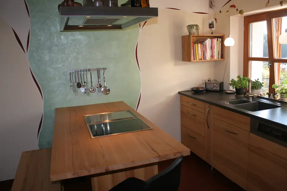 Die liebevolle Wandgestaltung macht die Massivholzküche zum Augenschmaus