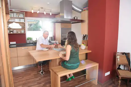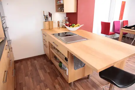 Durch die überstehende Holzarbeitsplatte des Mittelzentrums kann man sich gegenüber sitzen