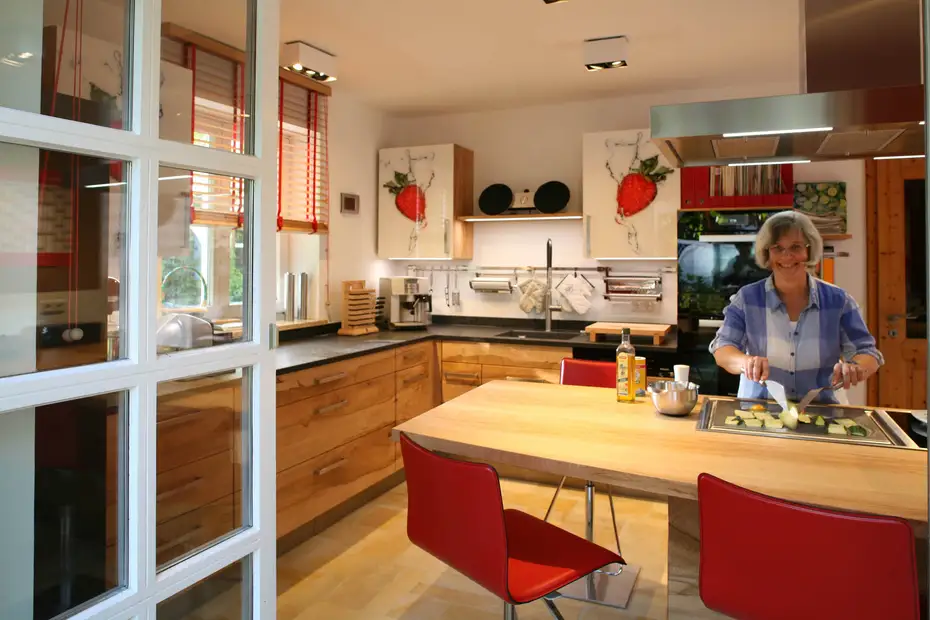 Frau Böhner liebt Erdbeeren, Symmetrie und funktionale Küchen. Und so haben wir gemeinsam aus vielen Vorschlägen den hier gezeigten erarbeitet. Der Blick beim Kochen auf die Terasse macht einfach Freu(n)de.