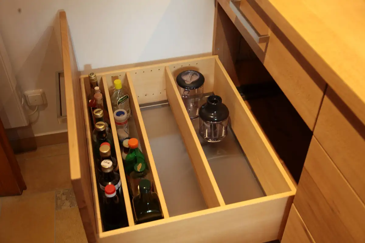Der Edelstahlboden unter den Öl und Essigflaschen lässt sich wunderbar reinigen