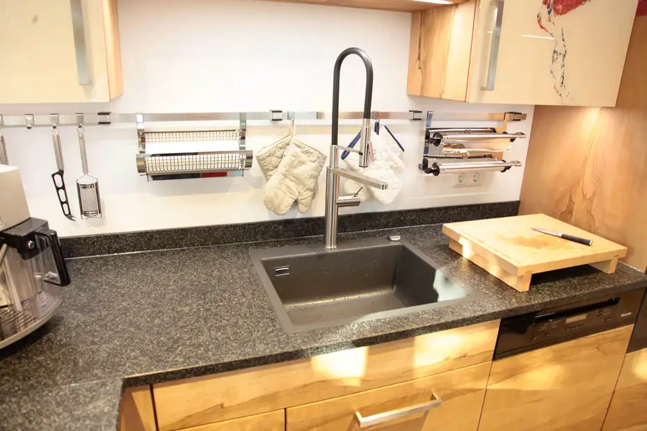 Die Keramikspüle ist flächenbündig in die Granitplatte eingebaut, die Mischbatterie super praktisch