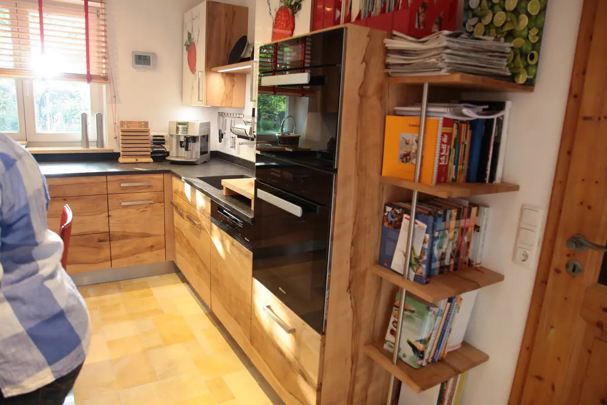 Man kann ja viele Ansichten von Küchen haben, von links, von rechts oder durch die Tür, aber wir sind der Ansicht, dass man Massivholzküchen langfristig betrachten sollte. Denn gerade die potentielle Lebensdauer von vielen Jahrzehnten (leider können wir bis jetzt erst 2 1/2 davon beweisen) und die Umzugstauglichkeit, die wir schon gezeigt haben, relativieren die höheren Anschaffungskosten im Vergleich zur Formaldehyd ausströmenden Spanplatte.