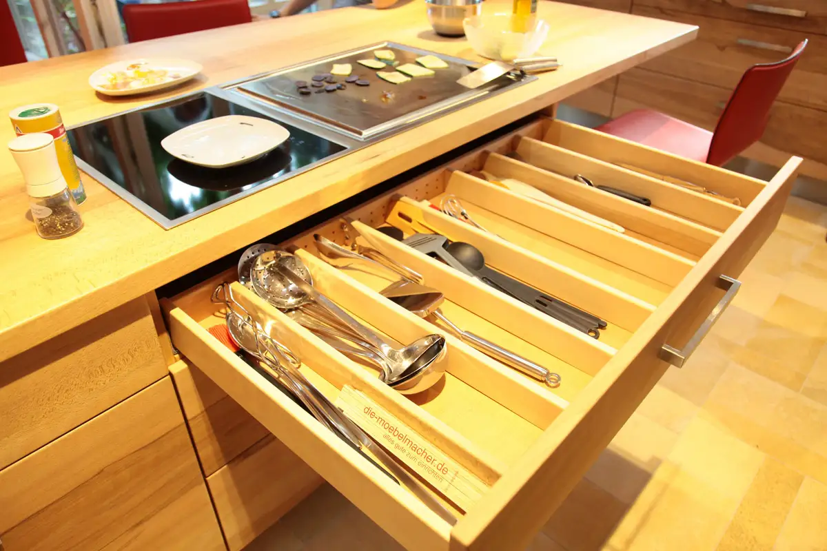 Die Kochbesteckeinteilung unter dem Kombinationskochfeld Induktion-Tepan Yaki