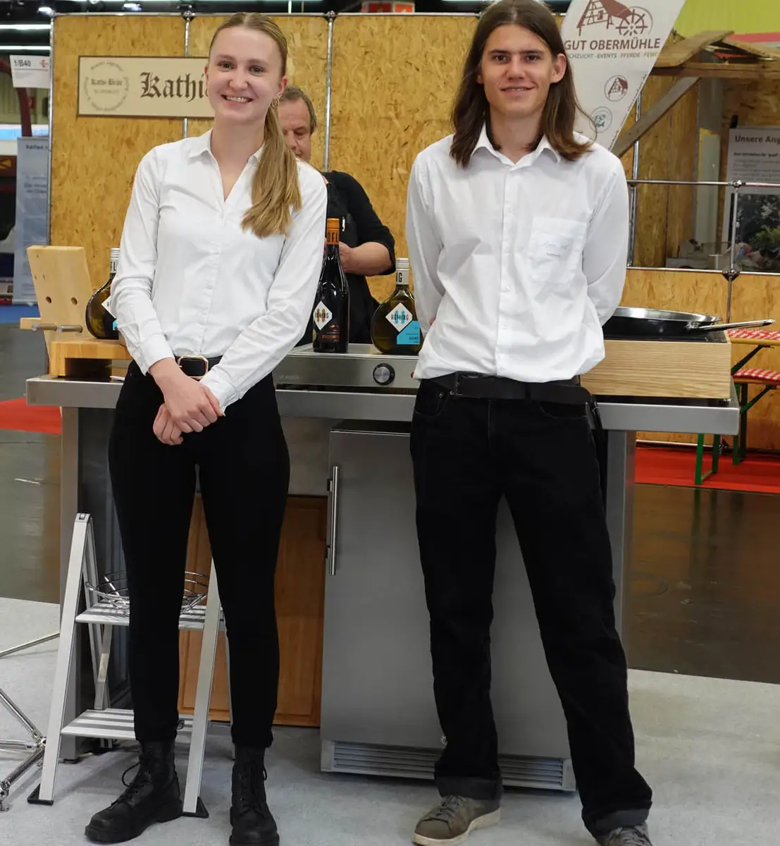 Aber natürlich kann man unsere Outdoorküche auch in Innenräumen einsetzten, zum Beispiel auf der Consumenta mit Induktionswok, Tepan Yaki und Schneidbrett und Emma und Aron