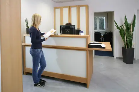 Der einladende Empfang aus Massivholz und Glas