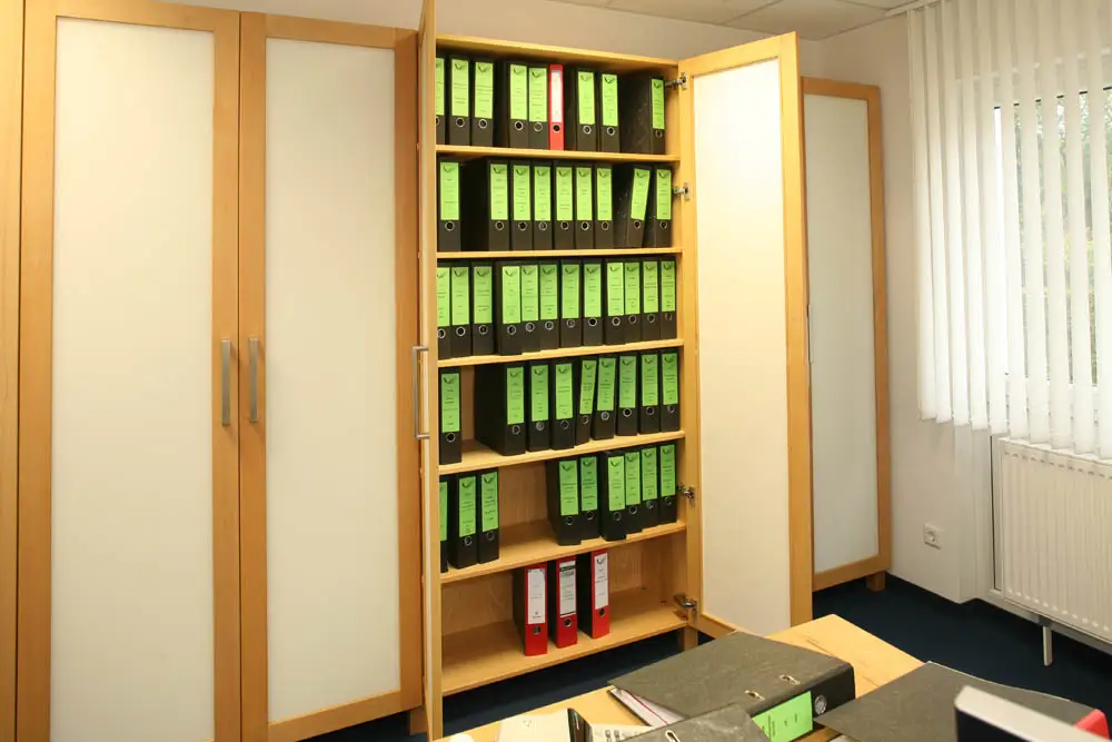 Einzig Dr. Hagen leistete sich den Luxus einer nur halbhohen Schrankreihe, alle anderen frönten dem Stauraum für Aktenordner.