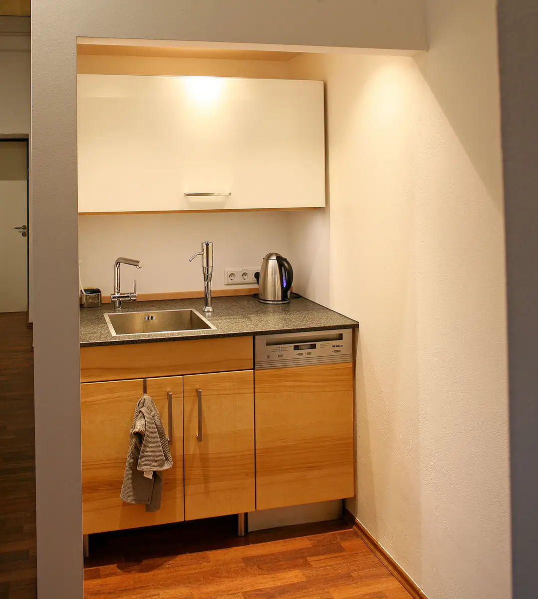 Das ist wohl die kleinste Küche, die wir jemals gebaut haben, aber auch sie bietet dank der Hochfaltklappe im Oberschrank eine Menge Stauraum. Meist wird dort Tee gekocht, aber ein mobiles Induktionskochfeld ist in den Möbeln versteckt, falls doch noch Kochmotivation entstehen sollte.