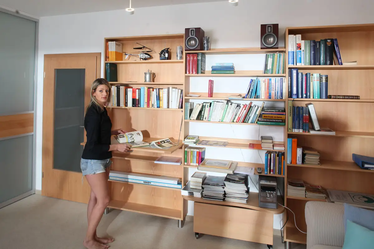 Immer mehr Franken richten sich ein Arbeits-, Hobby-, Lese-, Fernseh-, Musikhör- oder Rückzugszimmer ein. Hier in Spitzahorn. Die verstellbaren Fachböden wurden an die Bücherhöhe angepasst.