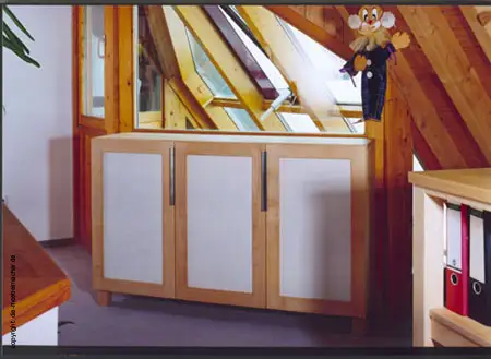 Das Büro für zwei haben die Möbelmacher schon 1997 für Familie Ditze am alten Wohnort gebaut und es natürlich auch im neuen Haus wieder integriert. So ist jeder Euro in Massivholzmöbel und lila pulverbeschichtetes Lochblech gut investiert. Die ganze Geschichte vom Bauklötzchenhaus können Sie auf dieser Sonderseite mit allen Möbeln sehen.