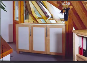 Arbeitszimmer mit Stauraum in der Dachschräge in Ahorn und Zwetschge