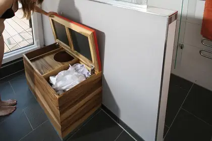 Der Clou bei der Wäschetruhe: Sie dient als Sitzbank und hat gleichzeitig einen Wäscheabwurf direkt vor die Waschmaschine in den Keller.