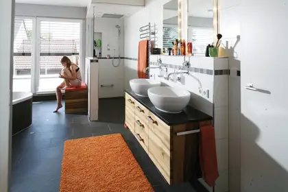 Weil der Franzose Julien Frandon gerade zu Gast war, haben wir ihn gleich als Model im Bad von Familie Herrmann eingesetzt. Also "Bad-boy" bitte mit "a" aussprechen, denn er ist ein Guter.