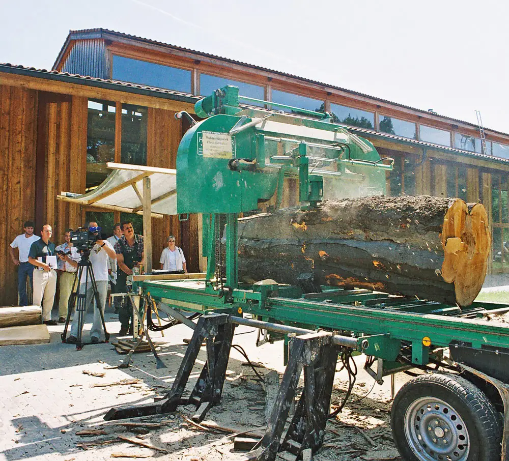 Mit der mobilen Säge werden auf unserem Gelände die edlen Stämme aus der Hersbrucker Alb zu Brettern unterschiedlicher Stärke gesägt