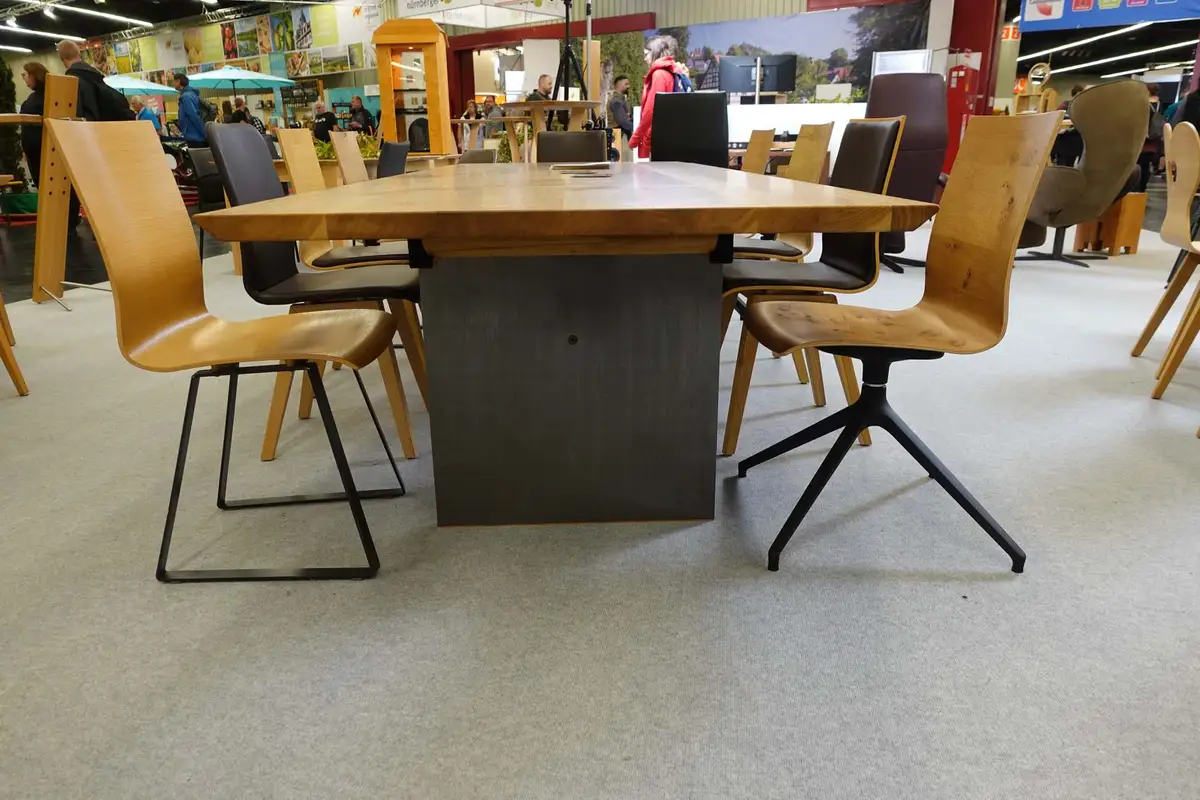 - Der Tisch ist völlig zargenlos und bietet grandiose Beinfreiheit bis zur Unterkante der Tischplatte, bis hin zur Möglichkeit des Überschlagens der Damenbeine