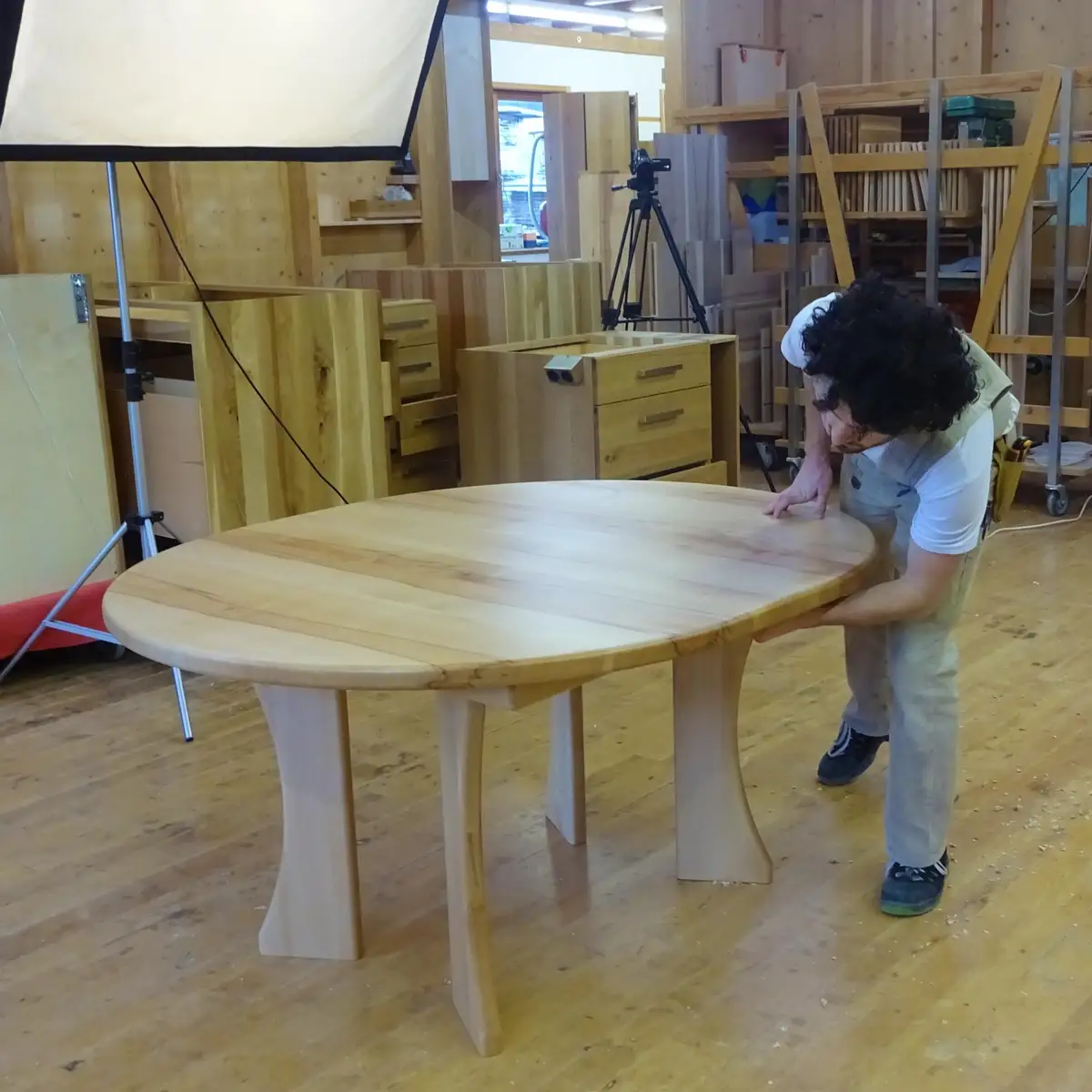 Die Tischform ist ein Kugelsechseck in gedämpfter Buche und natürlich ausziehbar