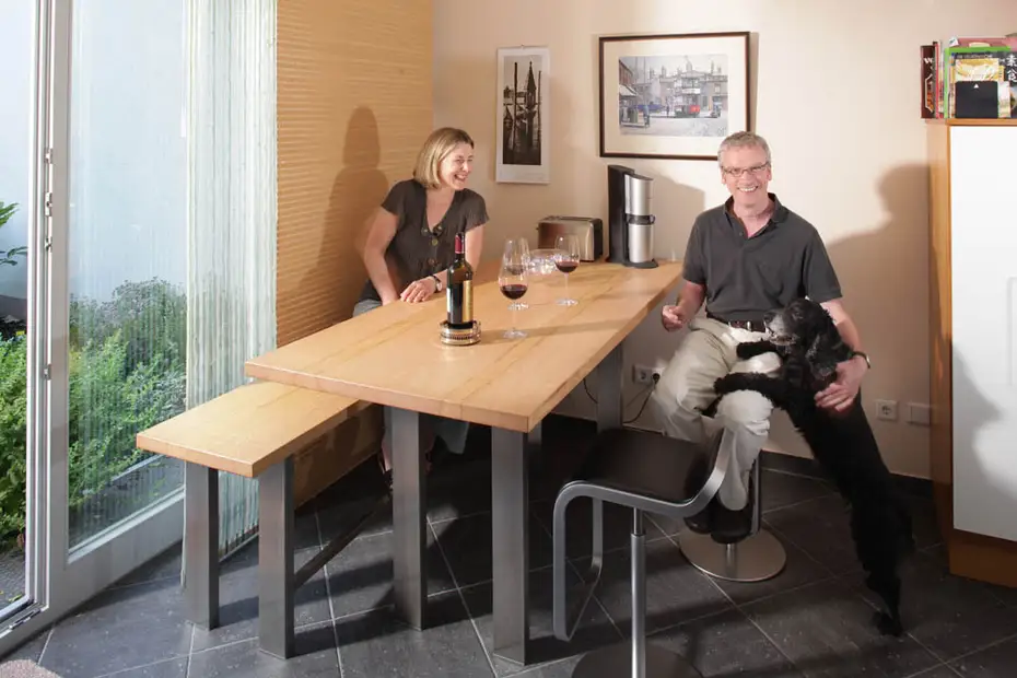 Ein Essplatz in der Küche kann gleichzeitig auch als Arbeitsfläche verwendet werden, wenn er mindestens 90 cm hoch ist, am besten abgestimmt auf die Hundegröße, man kann daran aber auch übersetzen, was Familie Batteson-Morris sogar beruflich tut. Der Hocker heißt "LEM" und ist in den angesagtesten Bars der Welt zu finden - oder eben in Unterkrumbach.