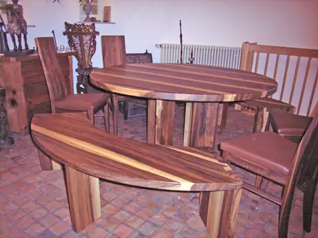 Tisch, Bänke und Stühle sind aus fränkischem Nussbaum.