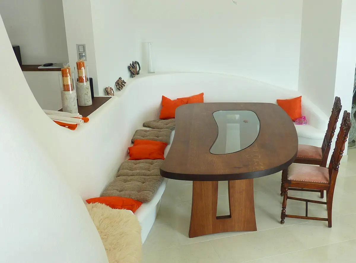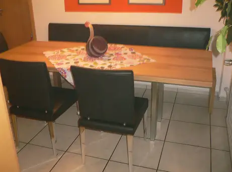 Essplatz mit gezinkter Vollpolsterbank und den Jori-Stühlen "Esrada"