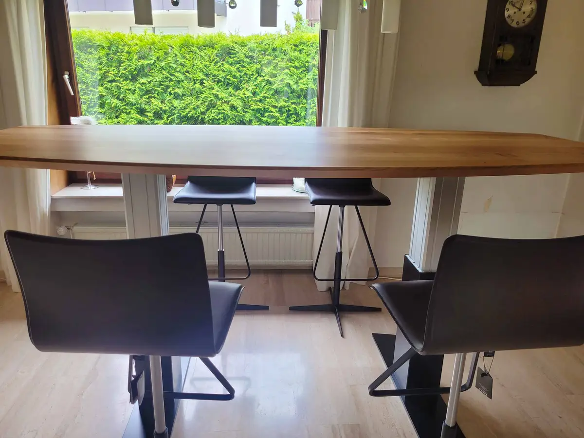 Hier mal ein paar Fotos von der Fertigung vom rohen Brett bis zum höhenverstellbaren Esstisch mit Schreibtischfunktion und Rollcontainer.