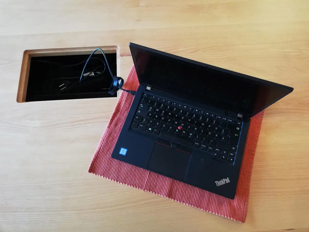 Tisch auf Rollen mit raffiniert in der Tischplatte versteckten Anschlüssen für Notebook und Co
