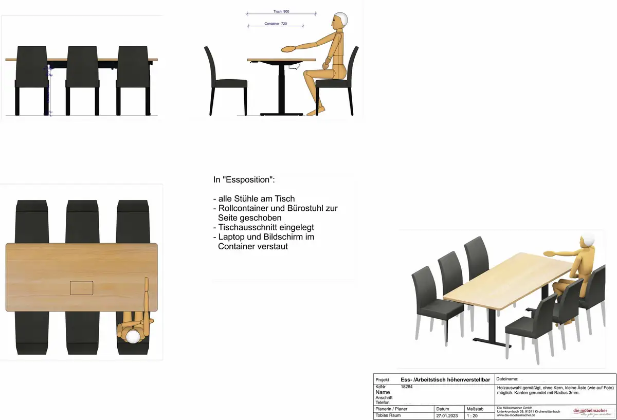 Dass wir eine Küche höhenverstellbar herstellen können, dass Schreibtische höhenverstellbar sind und sogar Stehtische oder -pulte diese Funktion beherrschen, hat sich, oder haben wir schon rumgesprochen. Vergleichsweise unbekannt sind aber höhenverstellbare Esstische. Das Esstischbeispiel auf Rollen hat im Zentrum eine mit Magnet abnehmbare Holzabdeckung über den Steckdosen und Netzteilen. Wenn die Stühle drumrumstehen, käme kein Gast auf die Doppelfunktion als höhenverstellbarer Arbeitsplatz, weil der Schreibtisch-Roll-Container unauffällig in der Nähe geparkt werden kann.