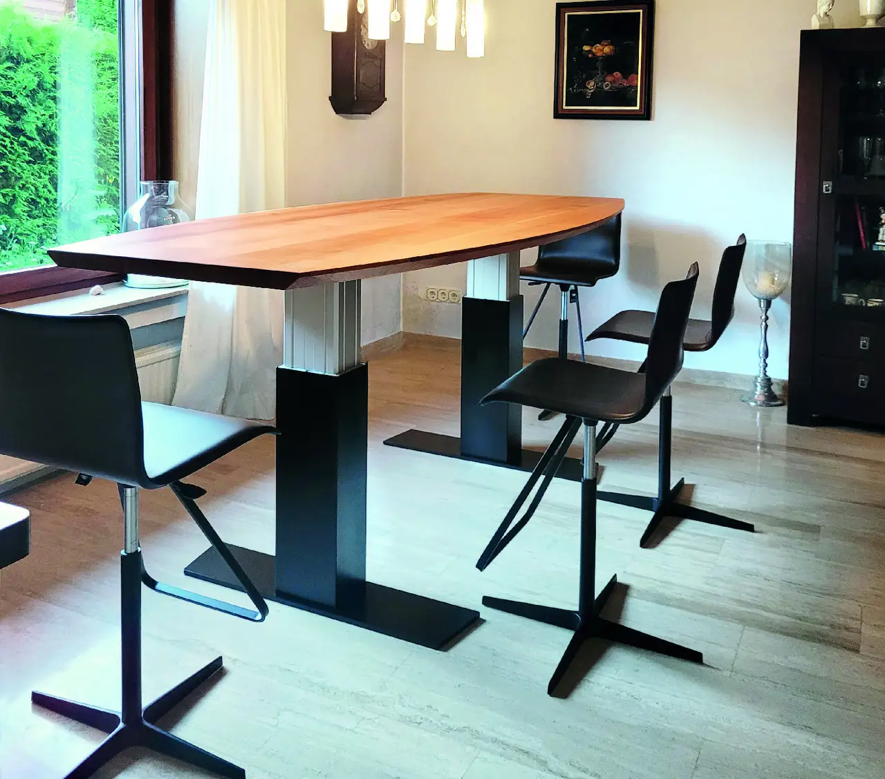 Dieser höhenverstellbare Ess- und/oder Konferenztisch hat einen eingebauten Kabelroller, ähnlich dem in Ihrem Staubsauger, also kann man ihn mit einem Griff an den Strom anschließen und auf die passende Höhe fahren. Alternativ wäre auch ein Akkubetrieb möglich. Die höhenverstellbaren Stühle dazu passen vom Esstisch bis zum Sektempfang oder – wie bei unserem Kunden – zu kleinen Konferenzen oder Vorstandssitzungen, die in stehenden Positionen wesentlich schneller vorübergehen, als im Sitzen. Egal, ob Schreibtisch, Stehtisch, Küche, Esstisch oder Montageplatz, alles verstellen wir mit den Hubsäulen von LINAK.