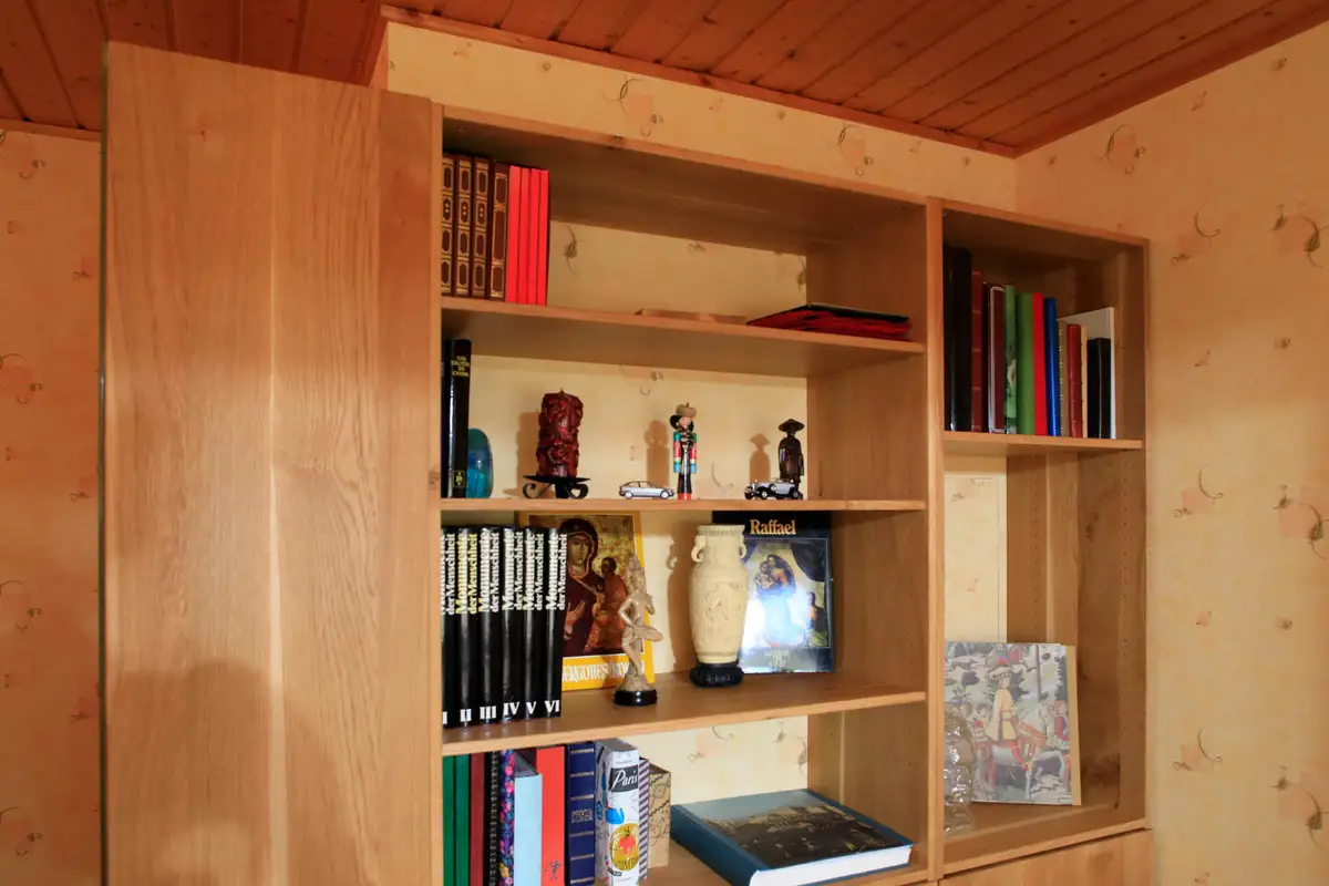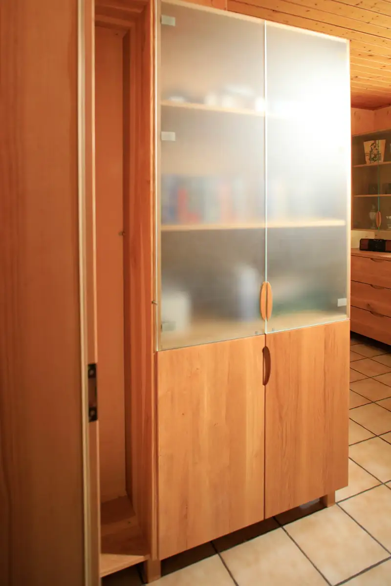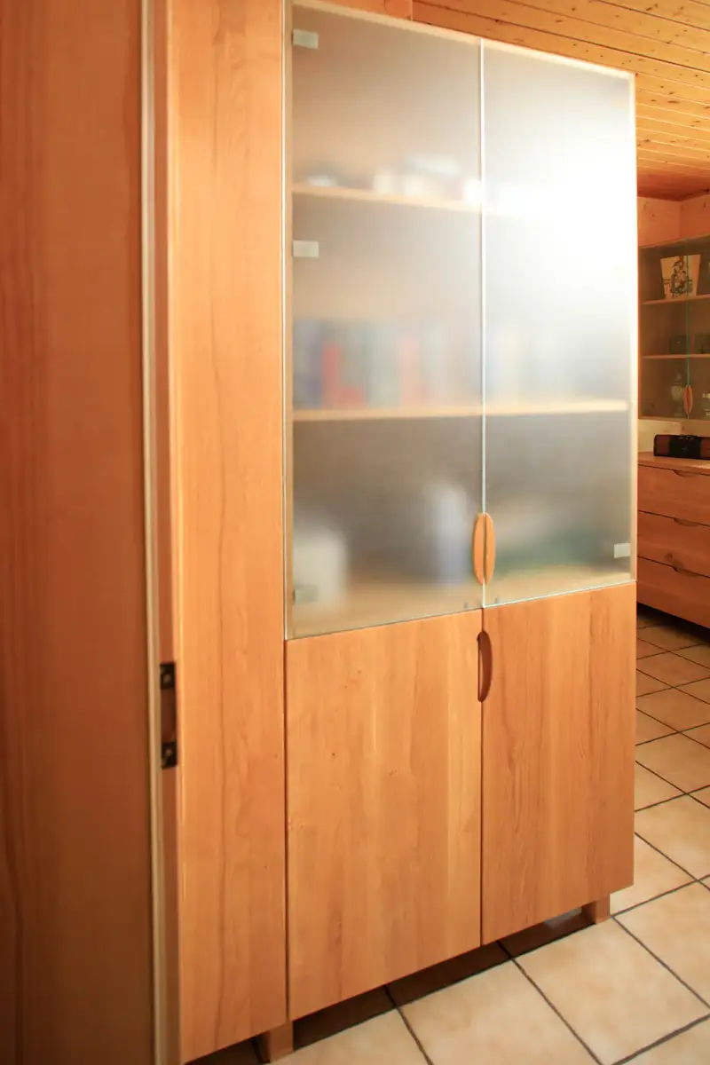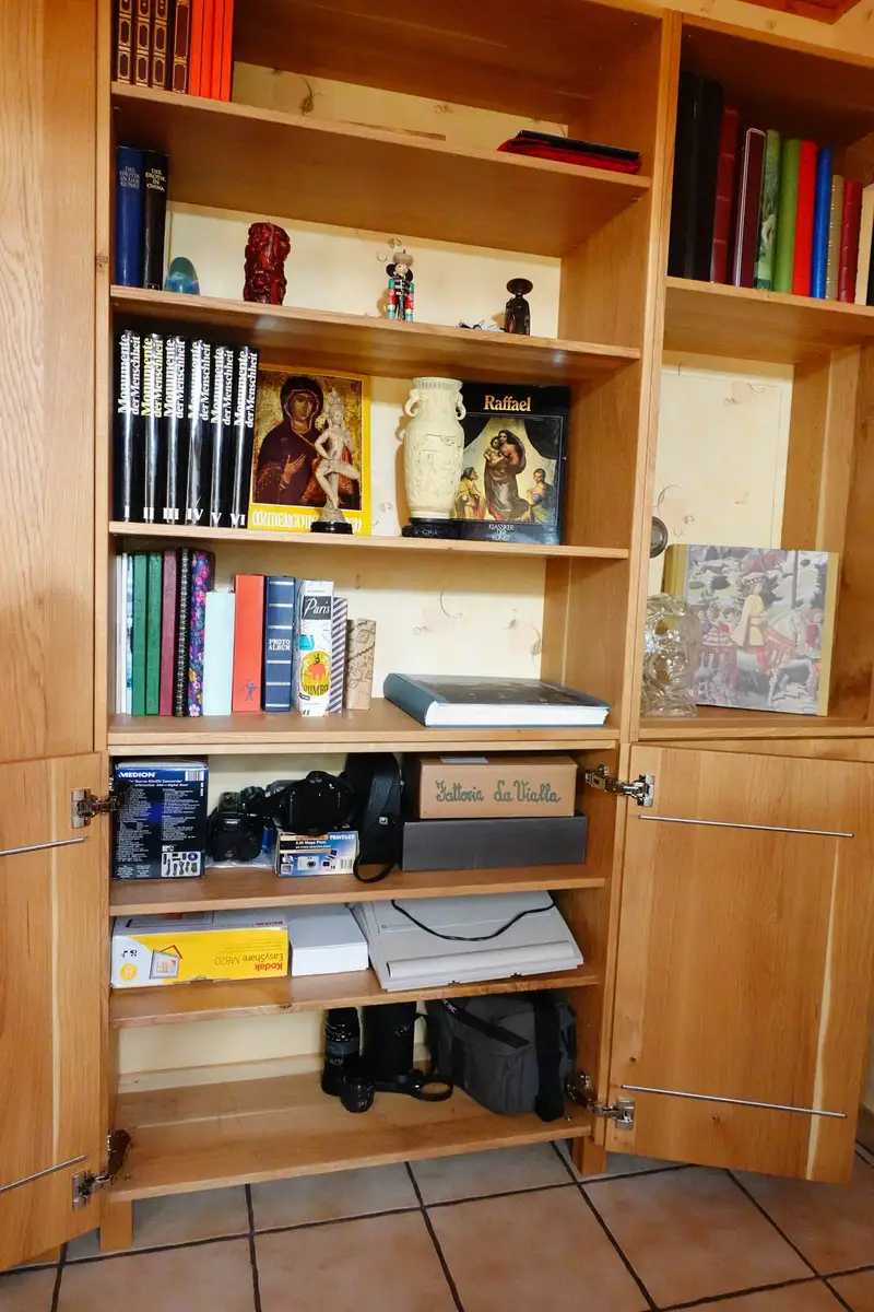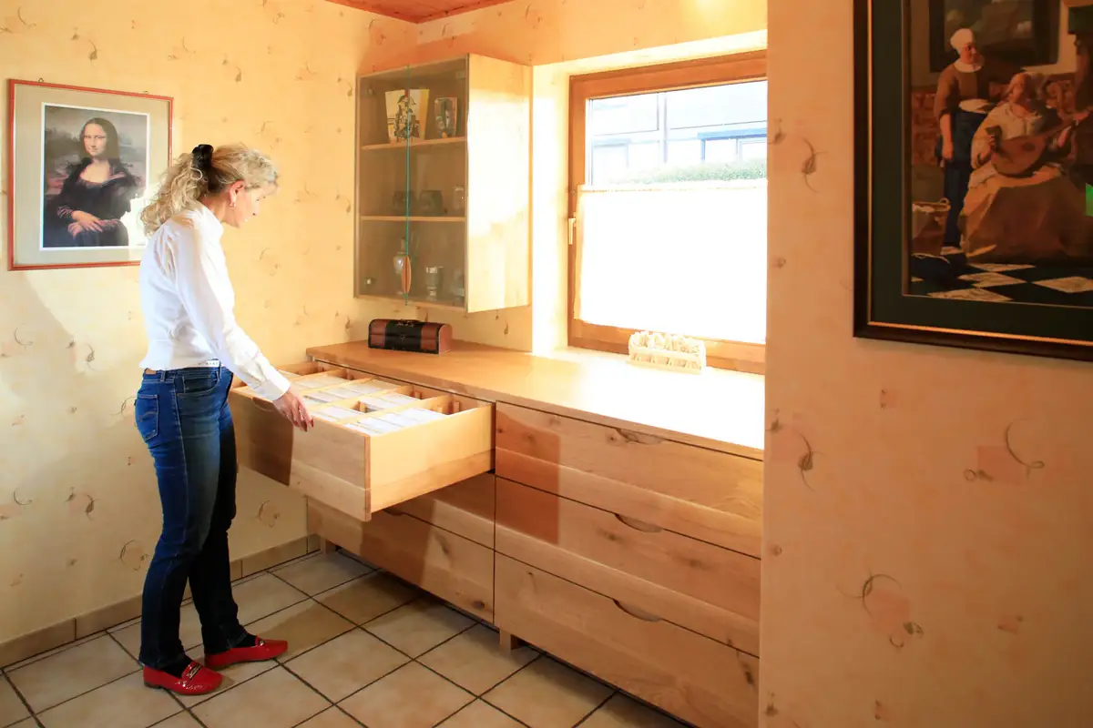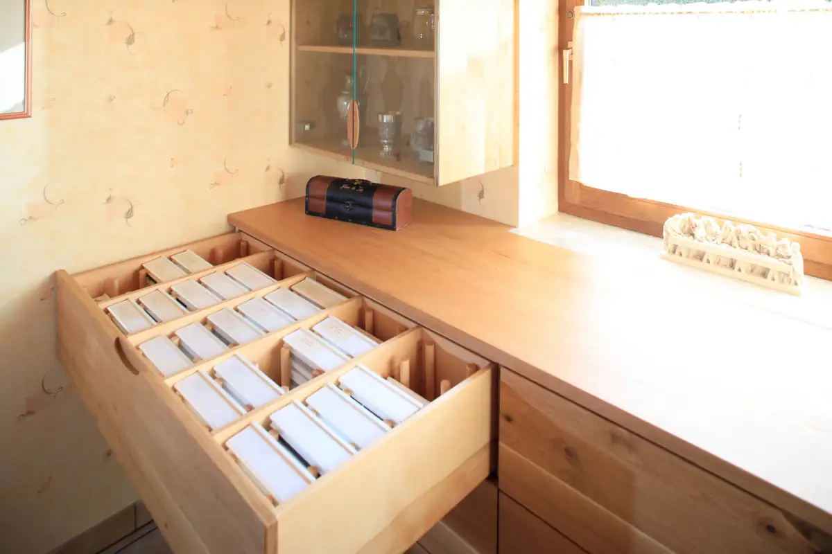 Für Frau Dr. Bräu-Dümler (Arbeitsmedizinische Praxis AMZ) und ihren stets fotografierenden Mann durften wir ausreichend Stauraum für einige tausend Diapositive schaffen, so nannte man damals Fotos, die in Laboren entwickelt und in Rahmen gepackt wurden, die man mittels Diaprojektor auf die Leinwand projizieren konnte. Und weil die beiden das Betrachten derselben auch heute noch schätzen, wurde jetzt eleganter und funktionaler Stauraum dafür geschaffen. Vorher war es ein ungeliebter Abstellraum mit alten Regalen und vielen Kartons. Gleichzeitig war im Wohnzimmer nicht genügend Platz für die Fotoausrüstung nebst Dias, die die Urlaube und das Leben der Familie widerspiegeln. Zusätzlich sollten die Pokale und Orden aus sportlicher Vergangenheit einen würdigen Platz bekommen und es musste Arbeitsfläche zum Pflegen der Diasammlung vorhanden sein. Fotosausrüstung, Diaprojektor, natürlich die Leinwand, alles sollte endlich funktional aufgeräumt sein. Die raffinierte Schubeinteilung erlaubt das schnelle Finden und das bequeme Herausnehmen aller sorgfältig sortierter Magazine.
