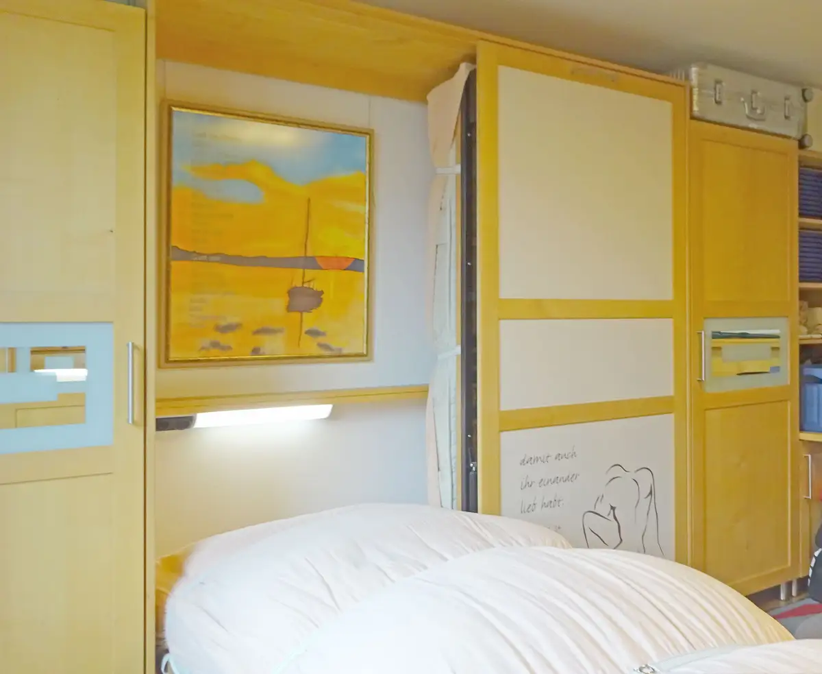 Dieser riesige Stauraum beherbergt alles, was man am besten in riesigen Schränken aus Ahorn mit bedrucktem weißen Glas verstaut. Zum Gästezimmer wird der Raum durch die beiden Klappbetten, bei denen das Bettzeug gleich mit drinbleiben kann.  Zusätzlich ist auch eine kleine Ablage nebst Licht integriert und an der Wand hängt ein schönes Bild.