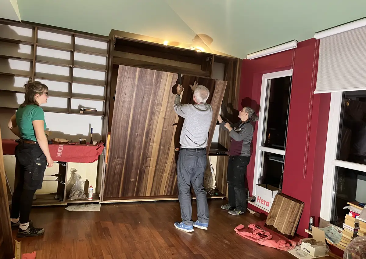 Nachdem die Montagearbeiten abgeschlossen sind und wir nun im Original das Bücherregal mit dem integrierten Wandbett betrachten können, wollten wir uns für die sehr gute Zusammenarbeit mit Ihnen und Ihrem Team bedanken. Wir sind begeistert von dem Ergebnis (siehe Bilder), von der Schönheit und  Maserung des Holzes, der Qualität und Ausführung der Handwerkskunst und der professionellen Montage.
