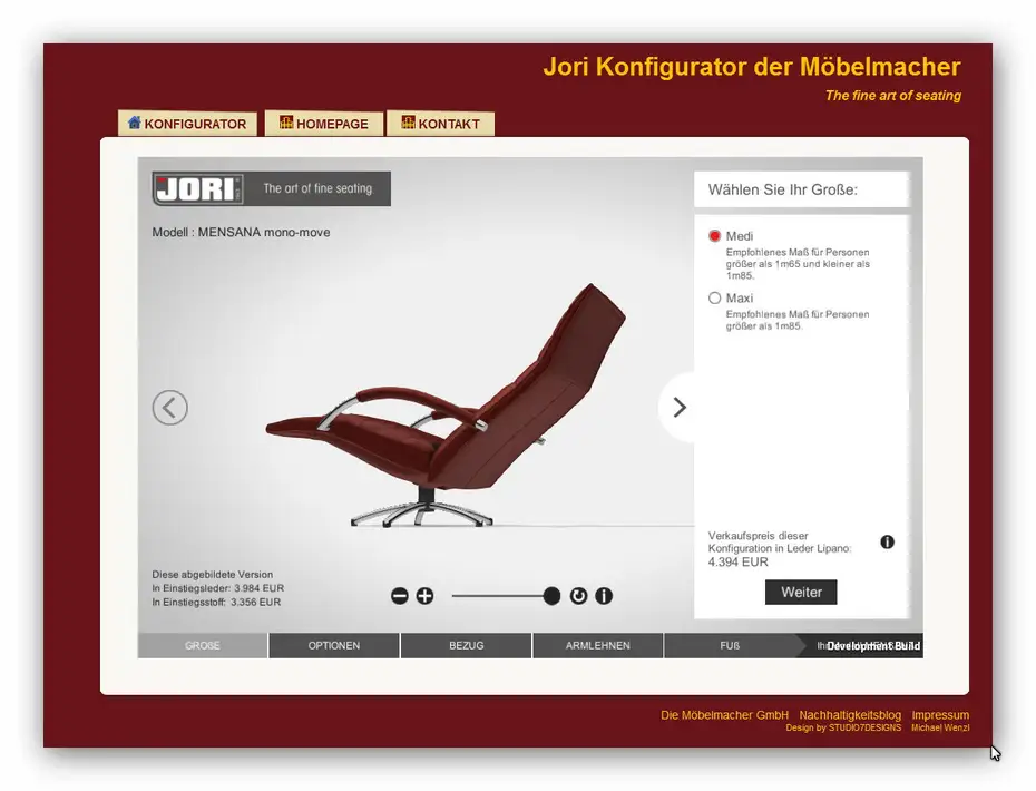 Es kann sein, dass sie - wie beim Autokonfigurator - erst ein kleines Programm installieren müssen, aber keine Angst, es geht schnell und problemlos und dann können Sie schon virtuell probefahren, äh -sitzen und wunderbare Kombinationen basteln. Hier zur Konfiguratorseite.