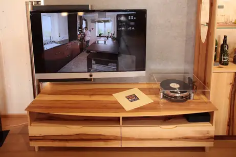 Der Hintergrund zum Fernseher, der digitalen Hifianlage und dem Plattenspieler